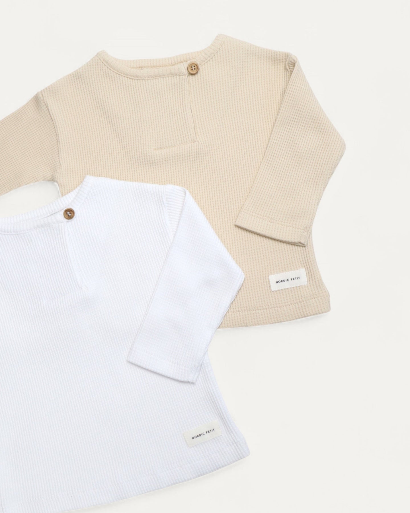 Jersey de manga larga con textura tipo waffle en 100% algodón suave, con cuello redondo y un botón decorativo de madera en la parte frontal. La textura suave aporta un estilo moderno y elegante. El logotipo discreto está situado en la parte inferior de la manga izquierda. Una prenda versátil que se combina fácilmente durante todo el año.